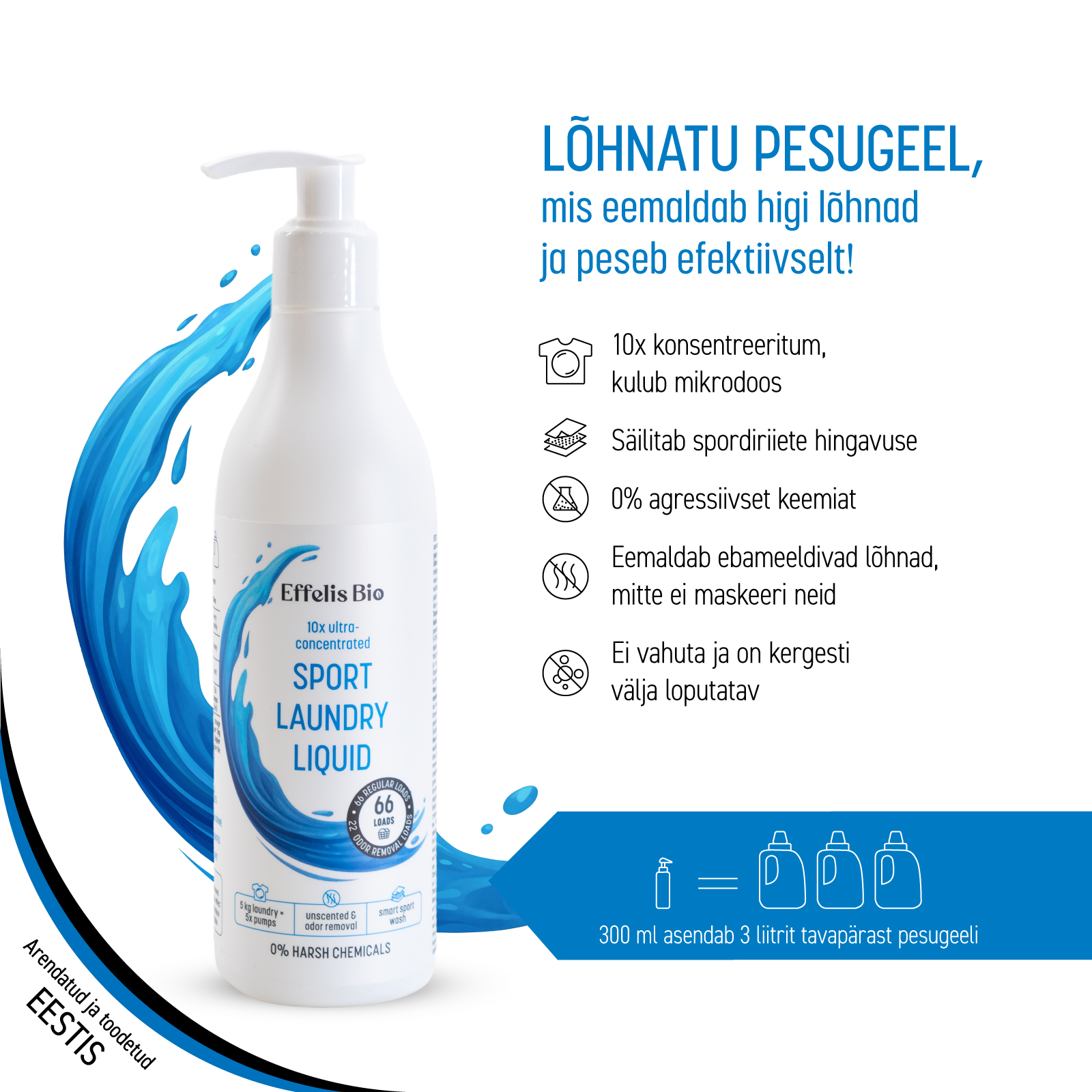 Smart Sport Wash on Eestis välja töötatud spetsiaalse ja ainulaadse retseptiga pesugeel. Selle koostis aitab eemaldada orgaanilisi lõhnu molekulaarsel tasandil ning pesta funktsionaalseid spordiriideid sügavuti kangakiudude vahelt. Nii aitab pesugeel taastada riiete puhta tunde ka siis, kui lõhnad on kangasse tugevamalt kinnitunud. Pesugeel sobib hästi tehniliste ja funktsionaalsete spordiriiete pesemiseks. See aitab säilitada membraankangaste hingavust ning hoida riiete tehnilisi omadusi. Toode sobib sünteetiliste, puuvillaste, värviliste ja valgete spordiriiete pesemiseks, kuid ei ole mõeldud siidi ega villa pesemiseks.