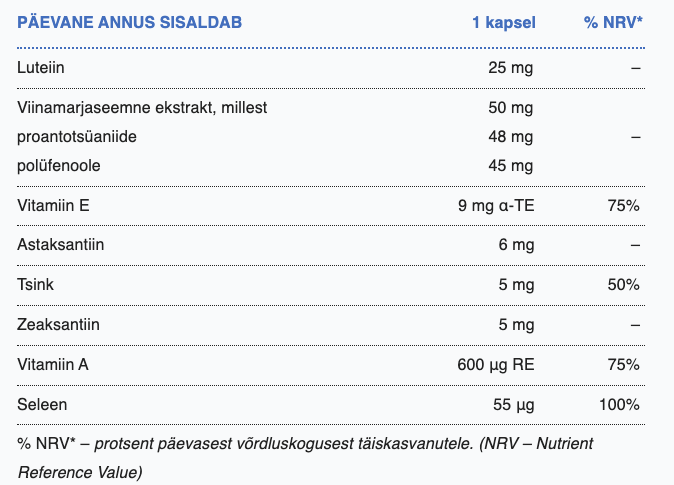 KOOSTISOSAD/ Astaksantiin (mikrovetikast Haematococcus pluvialis); luteiin ja zeaksantiin (kõrge peiulille Tagetes erecta õite ekstraktist); taimne kapsel (stabilisaator: hüdroksüpropüülmetüültselluloos); hariliku viinapuu (Vitis vinifera) seemnete ekstrakt (120:1, 95% proantotsüaniide, 90% polüfenoole); tsink (tsinkdiglütsinaat); vitamiin E (D-α-tokoferüülhappesuktsinaat); seleen (L-selenometioniin); vitamiin A (retinüülpalmitaat).