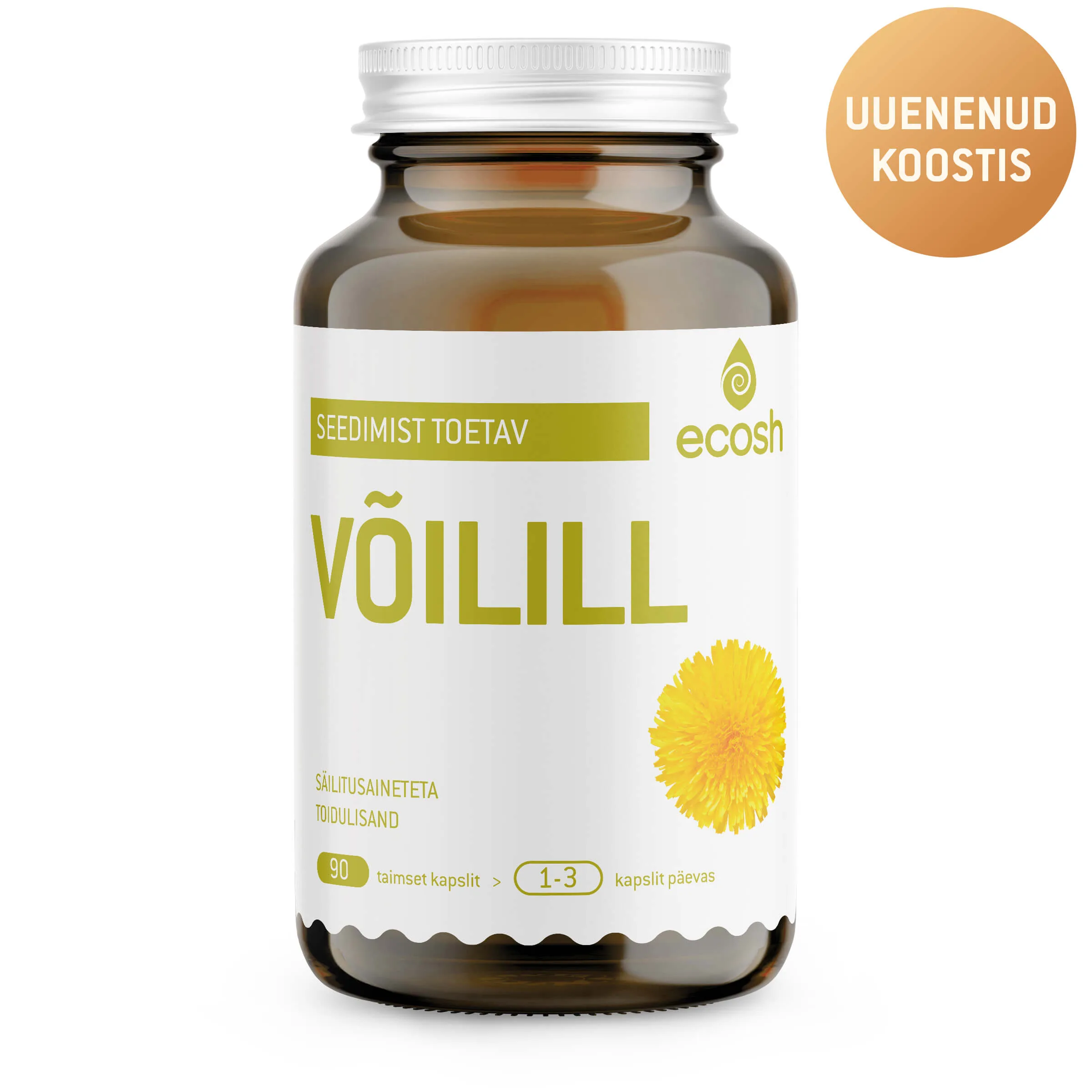Tootes sisalduvad võililleõied on pärit Eestist Madila Mahefarmist ja korjatud Ecosh’i inimeste poolt KOOSTISOSAD: hariliku võilille juure ekstrakt 4:1 (Taraxacum officinale), hariliku võilille juur (Taraxacum officinale), taimne kapsel (stabilisaator: hüdroksüpropüülmetüültselluloos), hariliku võilille õied (Taraxacum officinale).